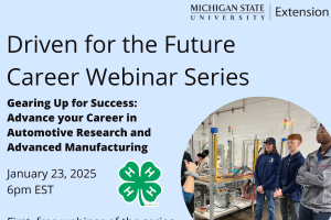 With the generous sponsorship of Toyota Research and Development, anyone who attends all of the live webinars and/or watches the recordings of the webinars by May 27 will receive an incentive for their participation. For additional resources, articles and registration to attend the free Zoom webinars or watch the webinar recordings, check out the Michigan 4-H Driven for the Future website.