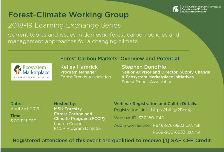 The Forest-Climate Working Group (FCWG) 2018-19 Learning Exchange Series covers current topics and issues in domestic forest carbon policies and management approaches for a changing climate. The FCWG represents a diverse group of forest interests including landowners, industry, conservationists, academia, and those active in carbon markets. The group has worked together for more than 8 years to advocate for state and federal policies that work to ensure sustainable forest use and prevention of land use change. We have currently been in the process of reinvigorating our focus and activities and welcome inquiries into our work. Please reach out if you have questions or think your organization may be interested in joining.