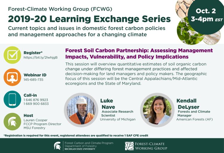 The Forest-Climate Working Group (FCWG) Learning Exchange Series covers current topics and issues in domestic forest carbon policies and management approaches for a changing climate. The FCWG represents a diverse group of forest interests including landowners, industry, conservationists, academia, and those active in carbon markets. The group has worked together for more than 8 years to advocate for state and federal policies that work to ensure sustainable forest use and prevention of land use change. We have currently been in the process of reinvigorating our focus and activities and welcome inquiries into our work. Please reach out if you have questions or think your organization may be interested in joining.