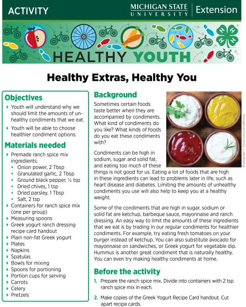 - Healthy Youth: Healthy Extras, Healthy You. This activity focuses on condiments and how to make your own ranch dressing, which is healthier.