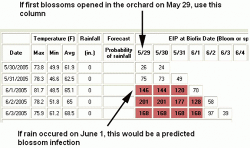 First pick the column that best corresponds to the first day blossoms opened in your orchard (see figure). The numbers in the squares gives the EIP (Epiphytic Infection Potential) for these blossoms. Bacterial populations (larger EIP) build on days with temperatures over 65ºF. When the EIP reaches 100, a rain or trauma event (strong wind or hail) will initiate a blossom infection. The higher the EIP, the greater is the risk of infection with rain or trauma.