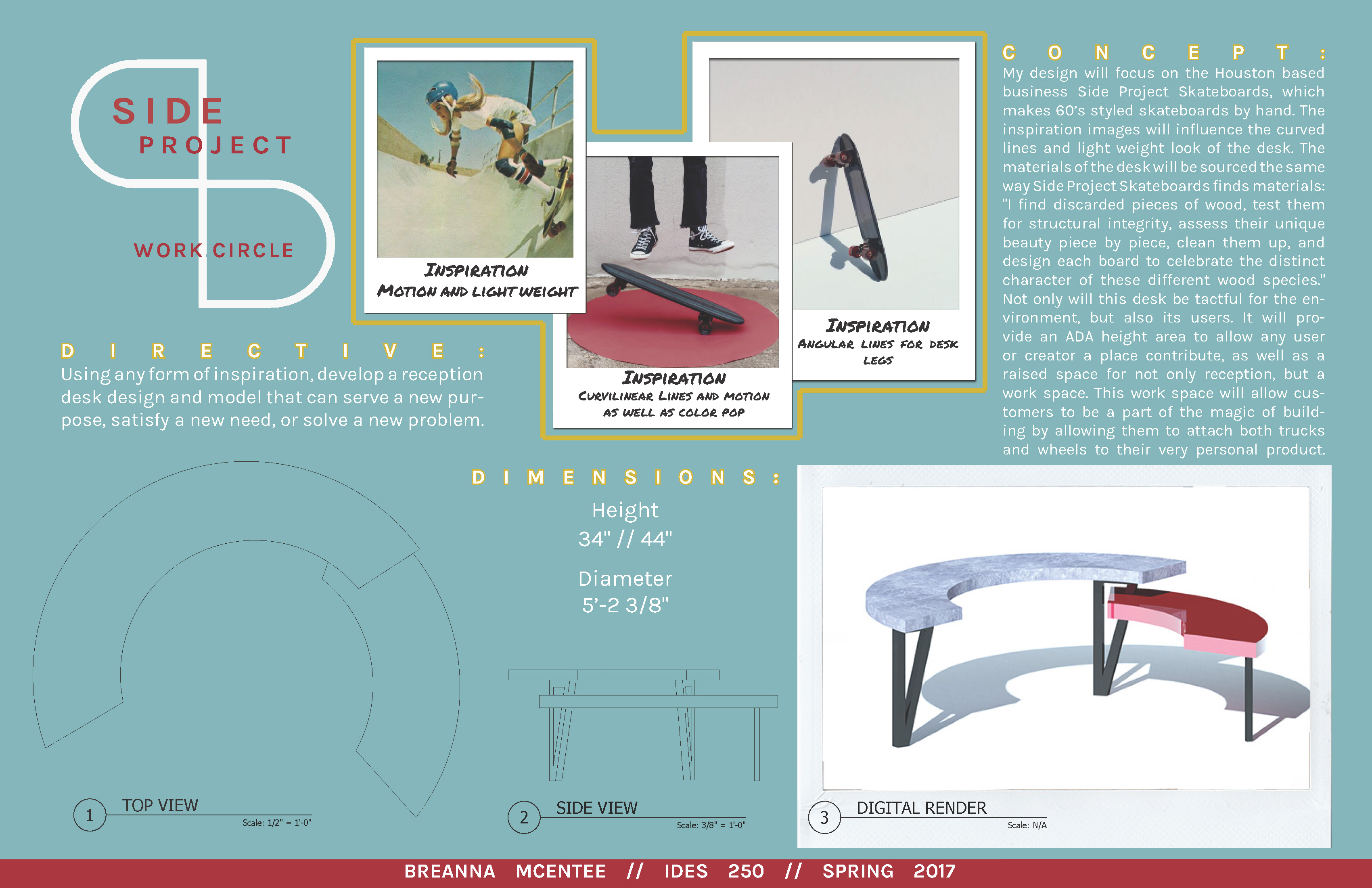 Design will focus on the Houston-based business Side Project Skateboards, which makes 60’s-styled skateboards by hand. The inspiration images will influence the curved lines and light-weight look of the desk. The materials of the desk will be sourced the same way Side Project Skateboards owner finds materials: “I find discarded pieces of wood, test them for structural integrity, assess their unique beauty piece by piece, clean them up, and design each board to celebrate the distinct character of these different wood species.” Not only will this desk be tactful for the environment, but also its users. It will provide an ADA height area to allow any user or creator a place to contribute, as well as a raised space for not only reception, but a work space. This work space will allow customers to be a part of the magic of building by allowing them to attach both trucks and wheels to their very personal product.