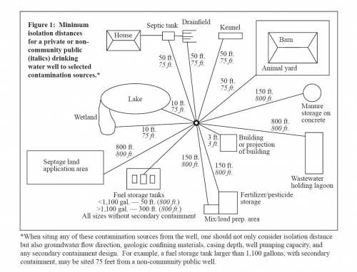 Isolation distances vary from structure or practice depending on the threat that they have to ground and surface water. The size and whether the structure/ tank have secondary containment play a role in the distance. The following chart gives a recommended minimum isolation distance for a few practices.