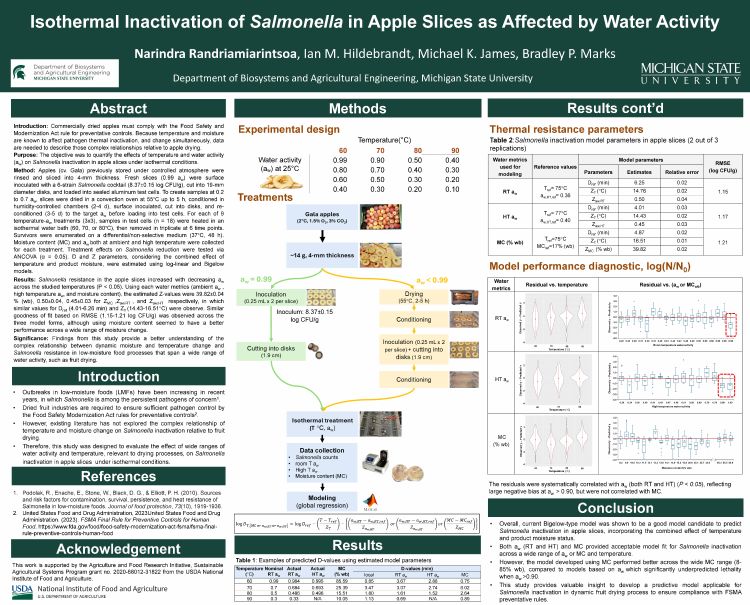 The objective was to quantify the effects of temperature and water activity on Salmonella inactivation in apple slices under isothermal conditions