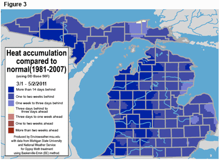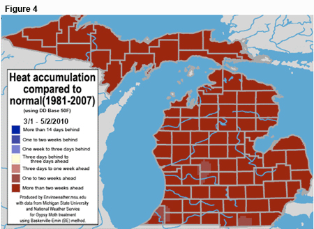 Enviro-weather map shows degree-day deficits throughout Michigan.