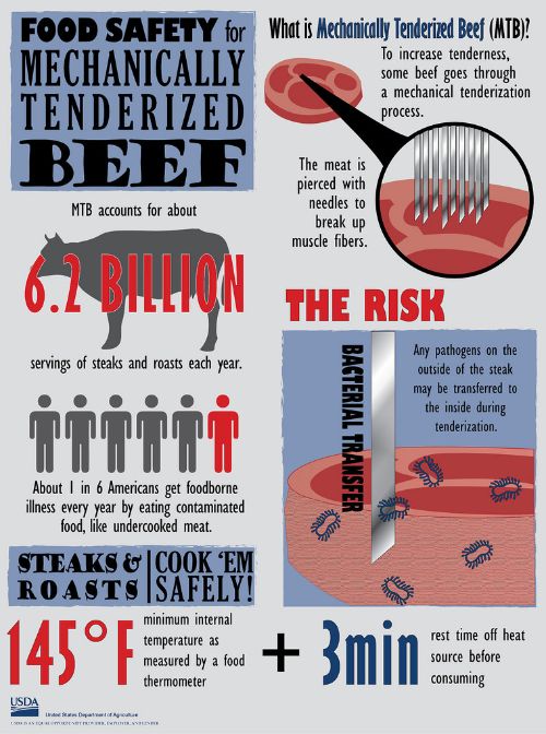 Beginning May 17, the United States Department of Agriculture’s Food Safety and Inspection Service (FSIS) began requiring processors to label Mechanically Tenderized Beef (MTB) and to provide safe cooking instructions on their products.