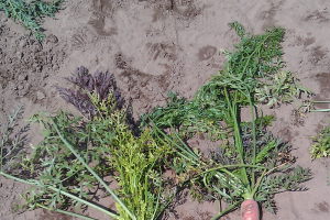 There are two common post-emergence herbicides that can go over the top of the carrots, celery and celeriac that offer weed control activity on both emerged and unemerged weeds. Caparol (prometryn) and Lorox (linuron) are similar chemistries and have comparable performance. They can be weak on some of the composite weeds like marestail, and knotweeds like ladysthumb. A complete efficacy table can be viewed through the Midwest Vegetable Production Guide.