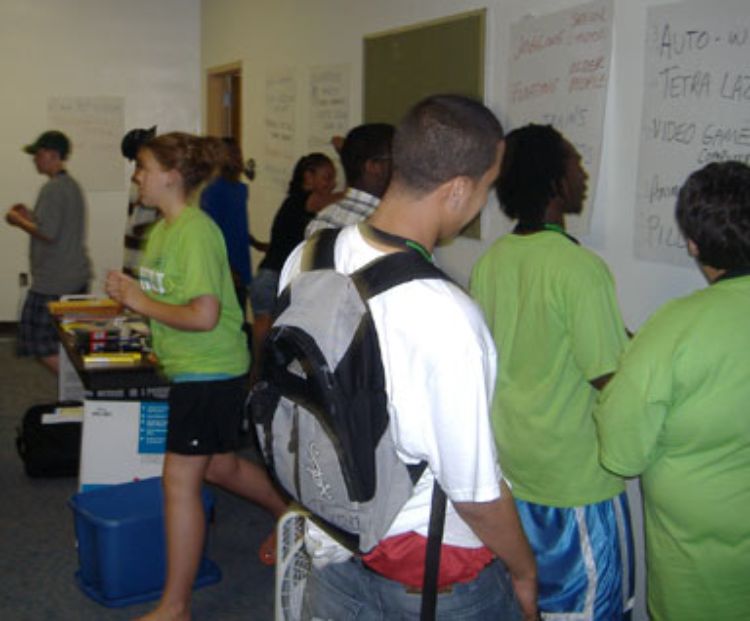 The session began with having each participant write a brief description of his or her idea, including what is unique about the idea and the biggest problem to overcome. Next, they had to share their paragraphs with the rest of the group and add any extra comments or thoughts about their ideas. While the youth read their ideas out loud, the adult chaperones tracked the information with colored sticky dots on newsprint, placing the dots together based on similarities.