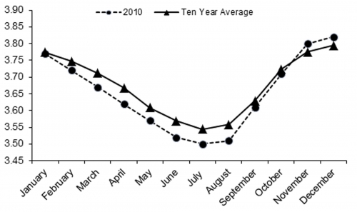 The higher than usual milk fat concentration seen this past winter is in stark contrast to the issue of low butterfat test seen during most of 2010 across the country. The figure on the right illustrates the low milk fat test during 2010 that was observed not only in Michigan, but in the whole United States. From February through October 2010, monthly butterfat percentage averages in the Mideast Federal Milk Marketing Order ranged from 0.4 to 0.9 % below the 10-year average for those same months. Although the exact reason for the struggle has not been pinpointed, it probably has to do with poor forage growing conditions in 2009.