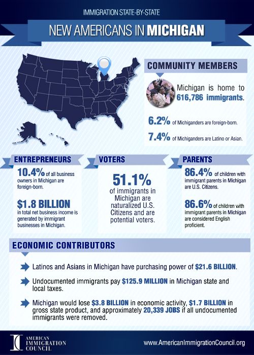 Immigrant populations just aren’t contributing economically to Michigan, they are also politically active as well. While only 1.2 percent of the state’s immigrant population (in 2012) is unauthorized and therefore unable to vote, 6.2 percent of Michigan’s “New Americans” are citizens with right to vote. Just in 2013, 51.1 percent of immigrants in Michigan became U.S. citizens and are now eligible to vote.
