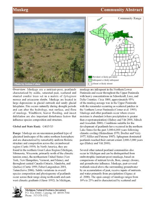 Another valuable MNFI data resource is a comprehensive list of Michigan's Natural Communities. A comprehensive listing is available for each natural community that exists in Michigan. Information included for each natural community includes a community overview, landscape context, soils, natural processes, vegetation, noteworthy animals, rare plants and animals, biodiversity management considerations, variation, similar natural communities and a link to the community abstract. Two examples of natural community types include muskegs and oak openings.