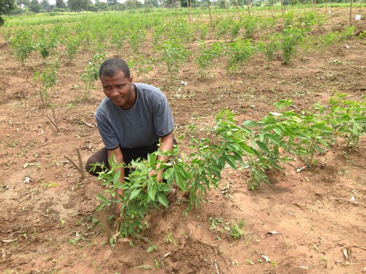 Owusu Danquah is evaluating two ways pigeon pea can act as a stake for yams: plant it in an alley, with yams in between, and let the plants grow together; or plant it near the yams, cut its thick stems off and use them as stakes.