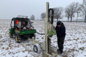On the Road with the Spartan Bus Tour: Gregory Bonito, President Kevin Guskiewicz and Plant Soil Microbial Sciences Chair Sydney Everhart (from left to right).