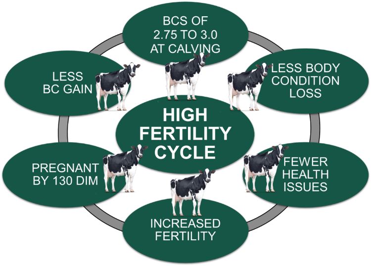 Farm profit increases when a greater percentage of the herd is in peak milk. For this to occur, greater control of calving interval with optimal reproduction is critical. Cow health and daily herd average milk production can be optimized when a high percentage of cows become pregnant and remain pregnant before 130 days in milk (DIM). Fewer cows calve with excessive body condition loss when this happens. Body condition loss following calving is highly associated with postpartum health problems, a key component of the High Fertility Cycle as denoted in Figure 1, shown above.