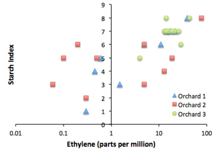 The relationship between ethylene and starch index has been pretty good in the samples we have been evaluating from growers orchards so far this season. See the simple graph for some Honeycrisp samples from east and west Michigan.