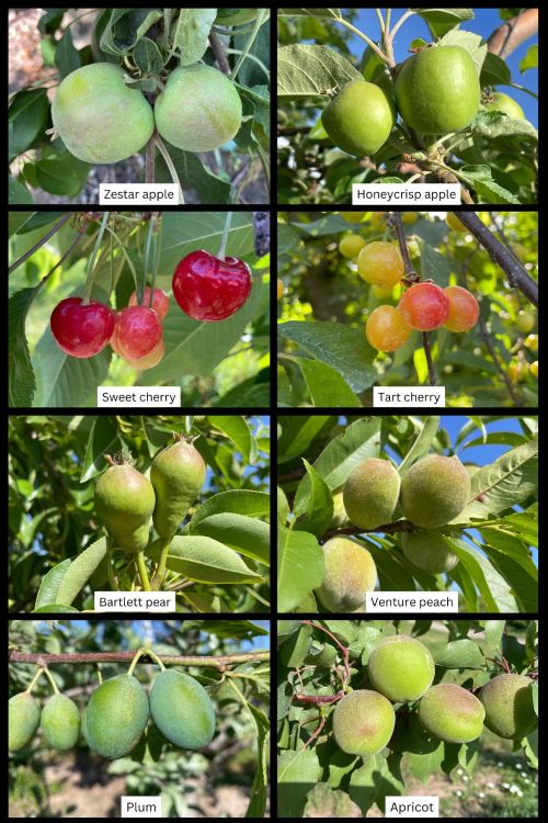 This week began with high hot and dry conditions across the west central and Grand Rapids, Michigan, regions. Fruitlets are growing steadily, and cherries are turning red. Tart cherry, sweet cherry, peach, pear and apple are sizing well (Figure 1), and June drop was observed in apples and peaches.