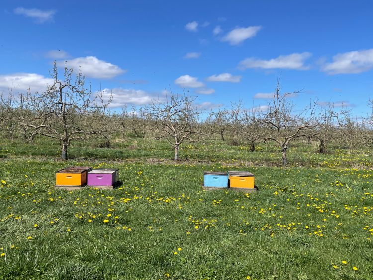 Sweet cherries, plums and some peaches are in full bloom. Apples are at pink with king bloom opening in early varieties. Pollinators are active in the orchards.
