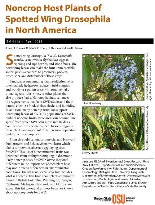 A new guide to the non-crop host plants used by spotted wing Drosophila (SWD) has just been published by Oregon State University, compiling information from collections made in Michigan, New York, Florida, California, Oregon, Washington and British Columbia. The article titled “Noncrop Host Plants of Spotted Wing Drosophila in North America” is now posted as a free PDF on the Factsheets page of the Michigan State University Spotted Wing Drosophila website.