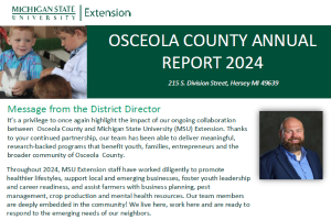 The 2024 Osceola County MSU Extension Annual Report contains program and participation information in regard to County residents. -