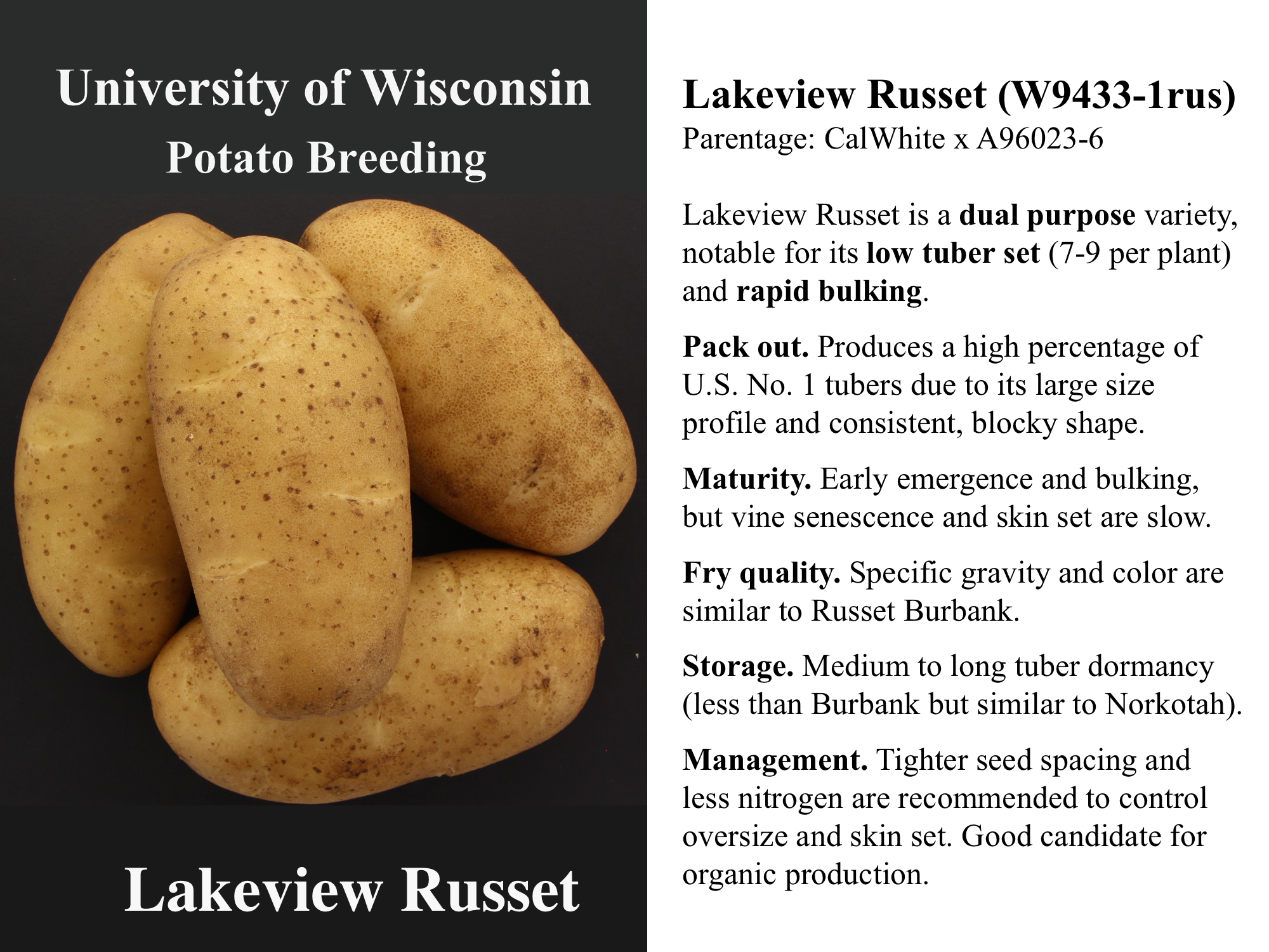 is a dual purpose russet notable for its low tuber set (7-9 per plant) and rapid bulking. It has a consistent, blocky shape, with a high percentage of US No. 1 tubers. It was produced by the University of Wisconsin Potato Breeding Program.