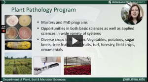 This page from the Department of Plant, Soil and Microbial Sciences, serves as our virtual exhibit, providing you with exciting opportunities to learn more about our research and connect with our faculty and students. Click on the links below to view the video interviews:
