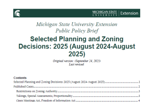 This public policy brief summarizes important court cases with rulings issued between August 2024 and August 1, 2025, in relation to planning and zoning in Michigan.