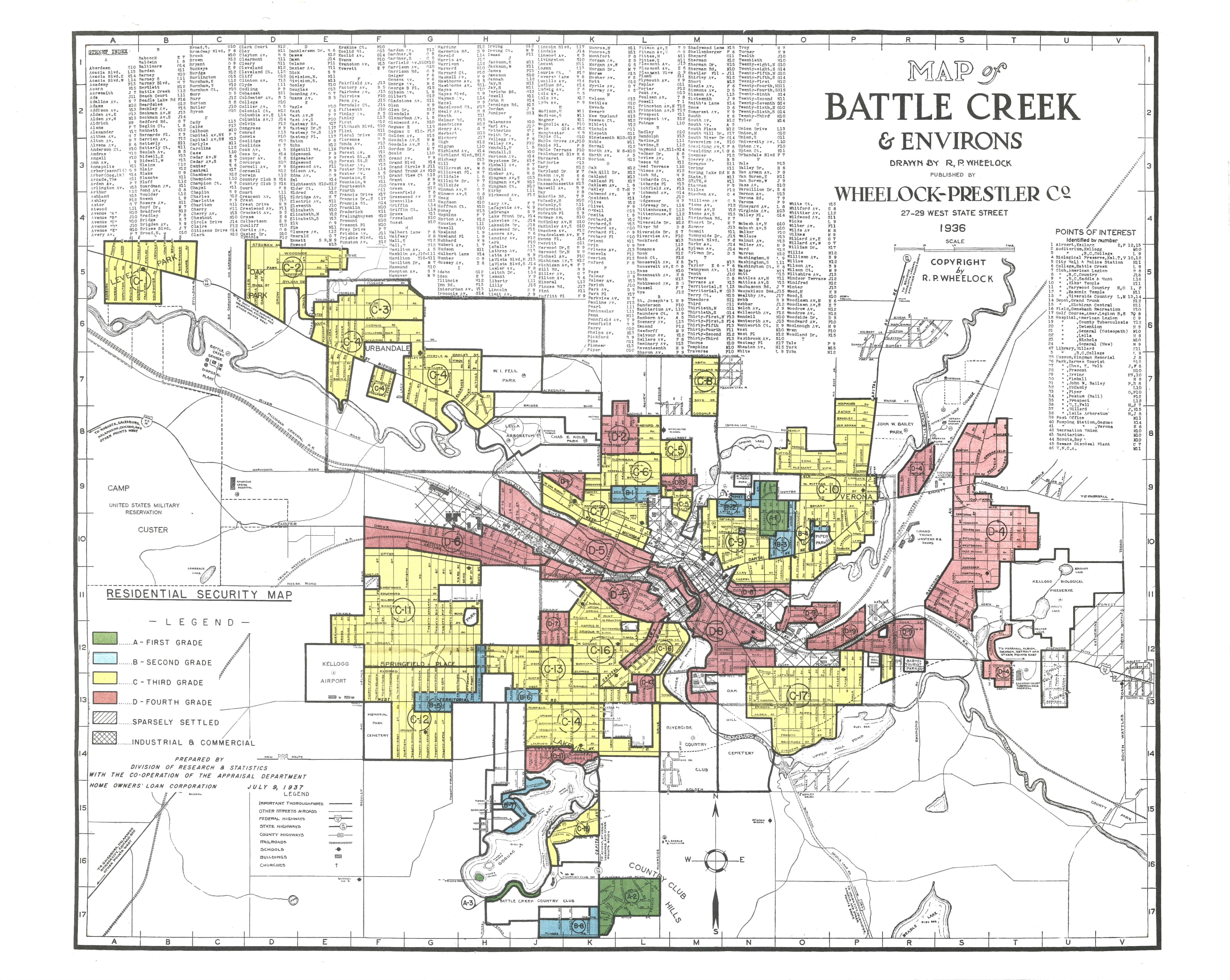 The federal government redline mapped Battle Creek in 1936. Consistent with the requirements of the government Underwriting Manual, the redline mapping specifically targeted residents of color, deeming their neighborhoods as “hazardous” to investment because they had residents of color or were even near residents of color. The original redlining map is shown below. While HOLC did not itself implement these redlining maps, it promoted these practices and showed private industry groups and the FHA how to reproduce these maps. We also have a map overlaying the original HOLC boundaries on 2019 segregation, which starkly show the continued effects of these racist practices. The strong visual connection between original HOLC grades and present-day racial segregation, shows a legacy of redlining on present-day outcomes.