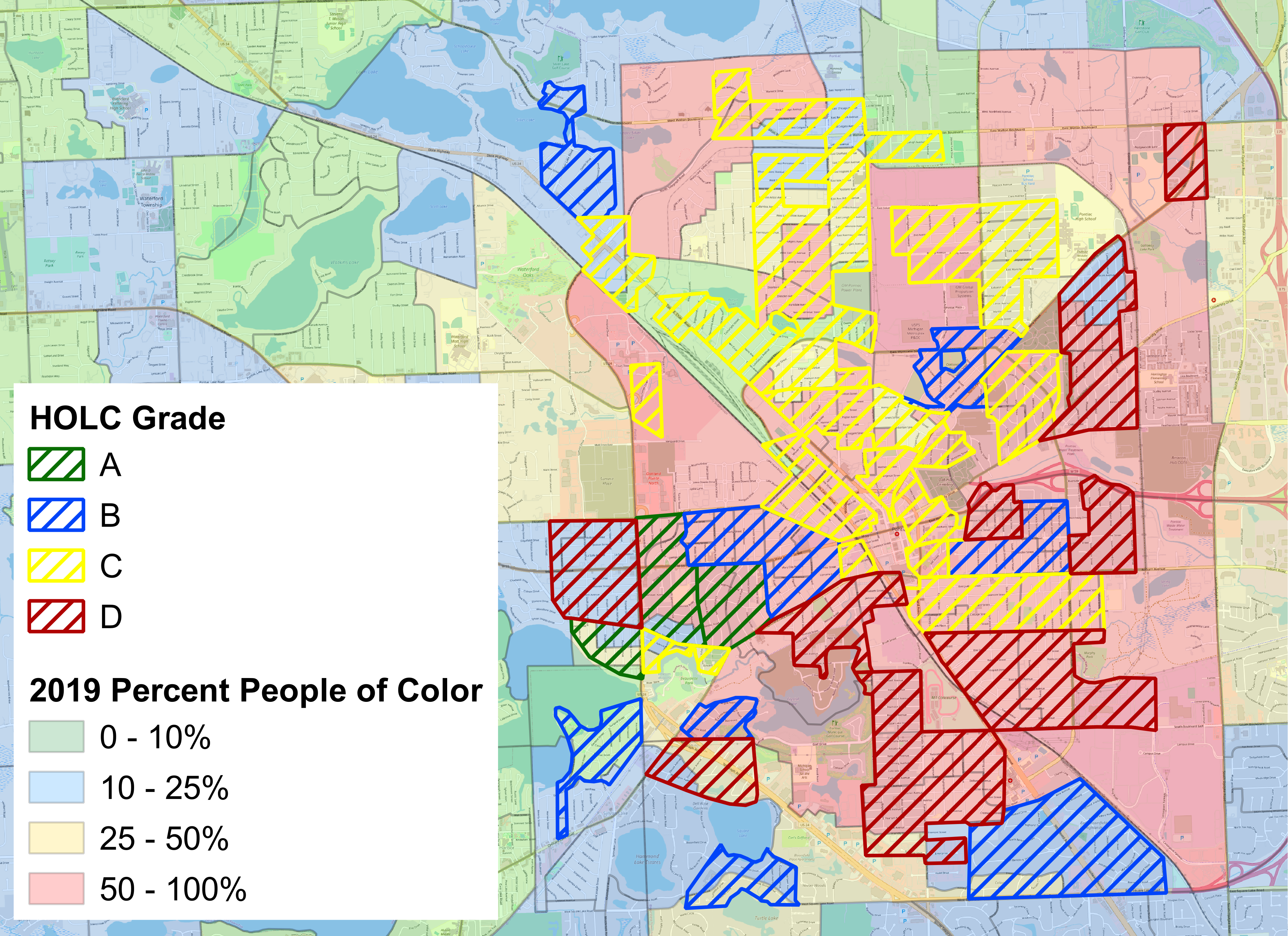 We overlay the historical HOLC “redlining” map on present-day demographic data to show the persistence and continued relevance of these racist policies on present-day segregation. We mirror the racist HOLC color gradation to help visualize the continued segregation, as a lasting impact of redlining.