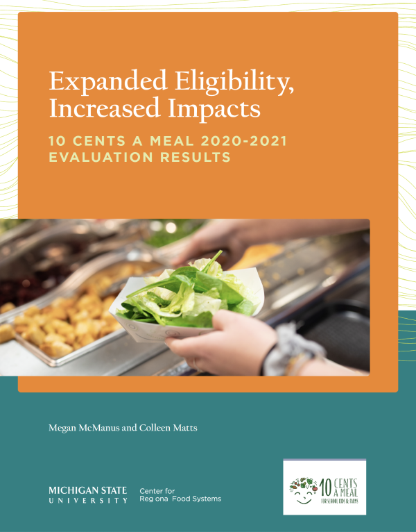 McManus, M., Matts, C. (2022). 10 Cents a Meal 2020–2021 Evaluation Results: Expanded Eligibility Increased Impacts. Michigan State University Center for Regional Food Systems. Retrieved from https://foodsystems.msu.edu/10-cents-eval-2022