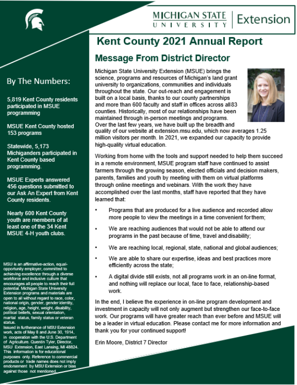 Michigan State University Extension (MSUE) brings the science, programs and resources of Michigan’s land grant university to organizations, communities and individuals throughout the state. Our out-reach and engagement is built on a local basis, thanks to our county partnerships and more than 600 faculty and staff in offices across all 83 counties. Historically, most of our relationships have been maintained through in-person meetings and programs. Over the last few years, we have built up the breadth and quality of our website at extension.msu.edu, which now averages 1.25 million visitors per month. In 2021, we expanded our capacity to provide high-quality virtual education.