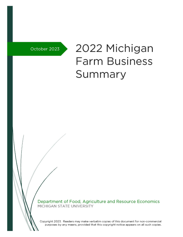 The Whole Farm Business Analysis is the first financial report and includes all participating farms of all types. This is a gauge of the financial performance of the average Michigan farm, completing the FINPACK FinAn business analysis through MSU Extension. The Farm Business Summary is divided into three Whole Farm Analyses subsets: 1) All Participating Farms - Whole Farm Report, 2) Crop Farms Only – Whole Farm Report, and 3) Dairy Farms Only – Whole Farm Report. There is also “cost of production” enterprise reports for corn, corn silage, soybeans, alfalfa haylage, winter wheat, and dairy enterprises. Farms are included as “crop” or “dairy” if over 70% of their gross farm income comes from their crop sales or milk sales/dairy cattle sales, respectively.