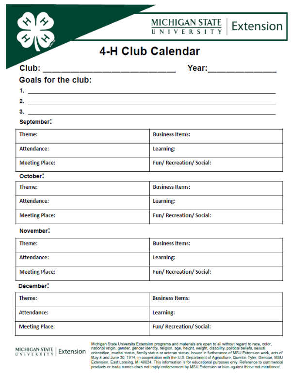 4-H Club Calendar