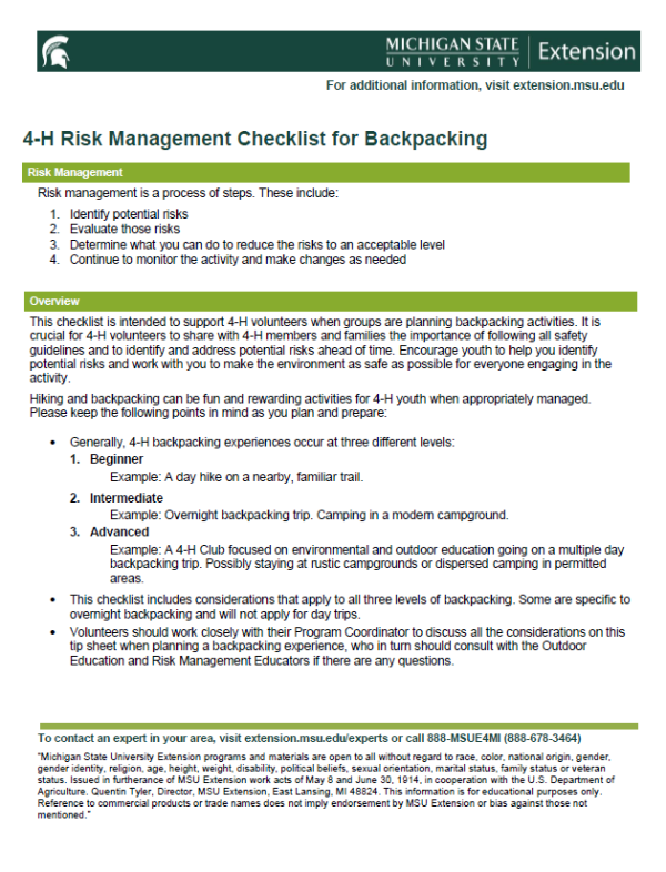 This checklist is intended to support 4-H volunteers when groups are planning backpacking activities. It is crucial for 4-H volunteers to share with 4-H members and families the importance of following all safety guidelines and to identify and address potential risks ahead of time. Encourage youth to help you identify potential risks and work with you to make the environment as safe as possible for everyone engaging in the activity.