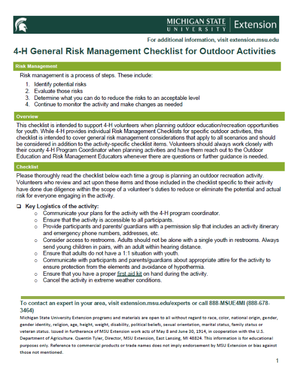 - For shorter organized day or overnight camps, 4-H Program Coordinators or other MSUE staff may be more involved in planning and addressing these checklist items and will pass the information on to volunteers.