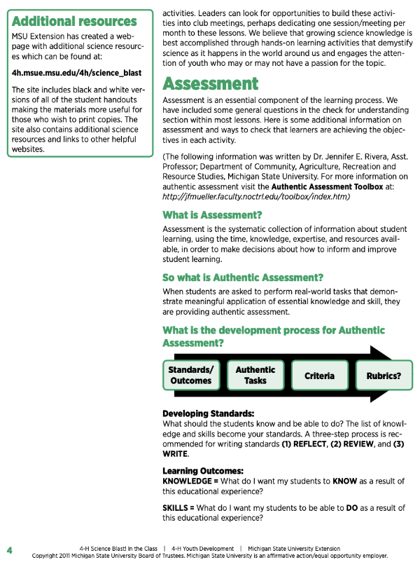Assessment is an essential component of the learning process. We have included some general questions in the check for understanding section within most lessons. Here is some additional information on assessment and ways to check that learners are achieving the objectives in each activity. (The following information was written by Dr. Jennifer E. Rivera, Asst. Professor; Department of Community, Agriculture, Recreation and Resource Studies, Michigan State University. For more information on authentic assessment visit the