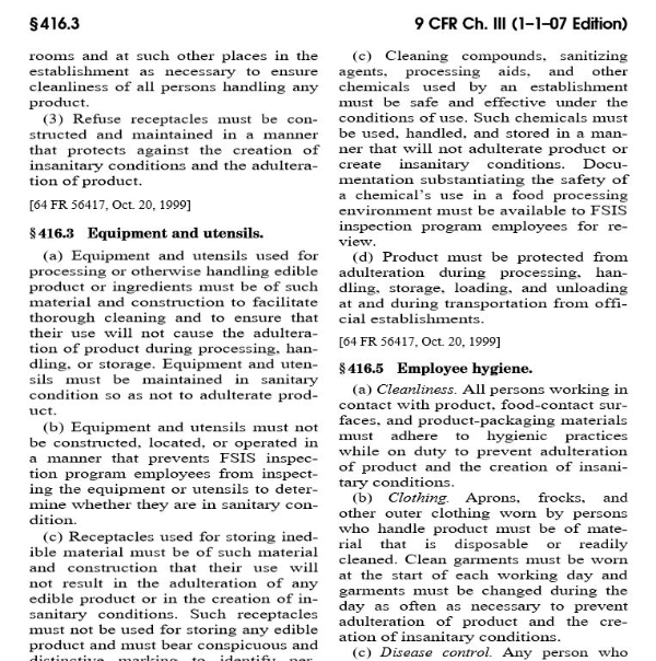 (a) Equipment and utensils used for processing or otherwise handling edible product or ingredients must be of such material and construction to facilitate thorough cleaning and to ensure that their use will not cause the adulteration of product during processing, handling, or storage. Equipment and utensils must be maintained in sanitary condition so as not to adulterate product.