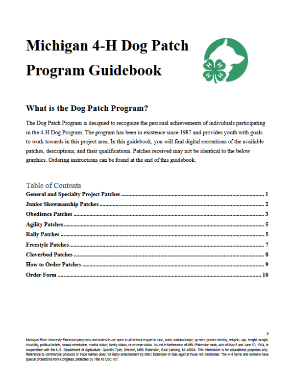 - Michigan 4-H Dog Patch Program Guidebook – This document describes the patches available for different levels of achievement in the 4-H dog project, outlines how to earn each patch, explains how to order patches and lists patch costs. (Updated December 2025, 10 pages)