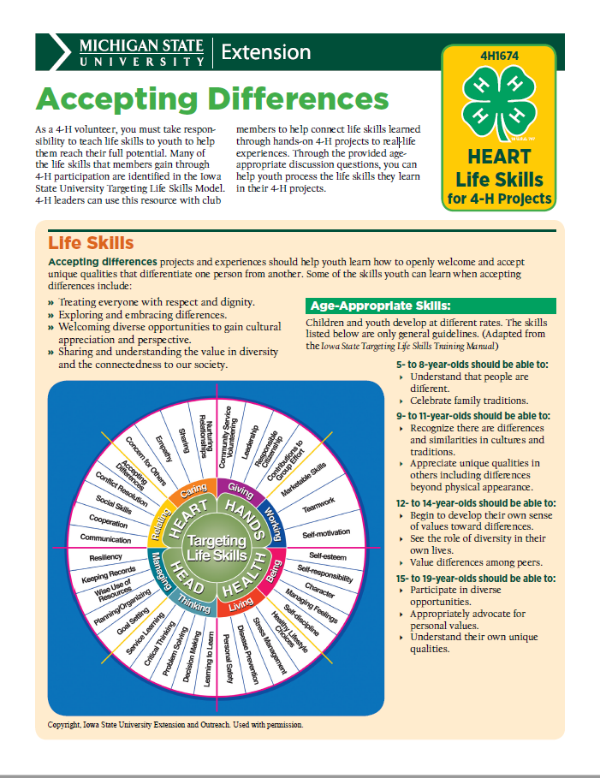 As a 4-H volunteer, you must take responsibility to teach life skills to youth to help them reach their full potential. Many of the life skills that members gain through 4-H participation are identified in the Iowa State University Targeting Life Skills Model. 4-H leaders can use this resource with club members to help connect life skills learned through hands-on 4-H projects to real-life experiences. The 4-H Heart Life Skills sheets focus specifically on helping young people connect those life skills under the area of the heart on the Targeting Life Skills Model.