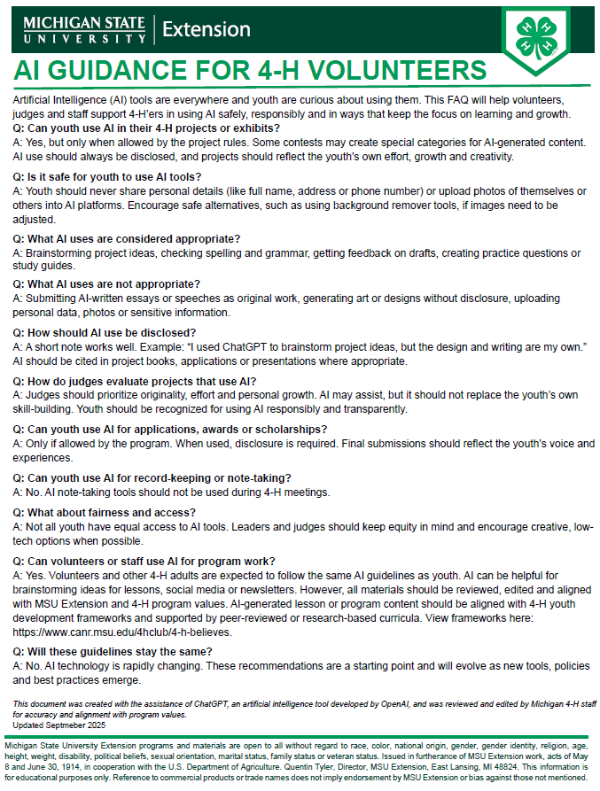 A: Yes. Volunteers and other 4-H adults are expected to follow the same AI guidelines as youth. AI can be helpful for brainstorming ideas for lessons, social media or newsletters. However, all materials should be reviewed, edited and aligned with MSU Extension and 4-H program values. AI-generated lesson or program content should be aligned with 4-H youth development frameworks and supported by peer-reviewed or research-based curricula. View frameworks here: https://www.canr.msu.edu/4hclub/4-h-believes.