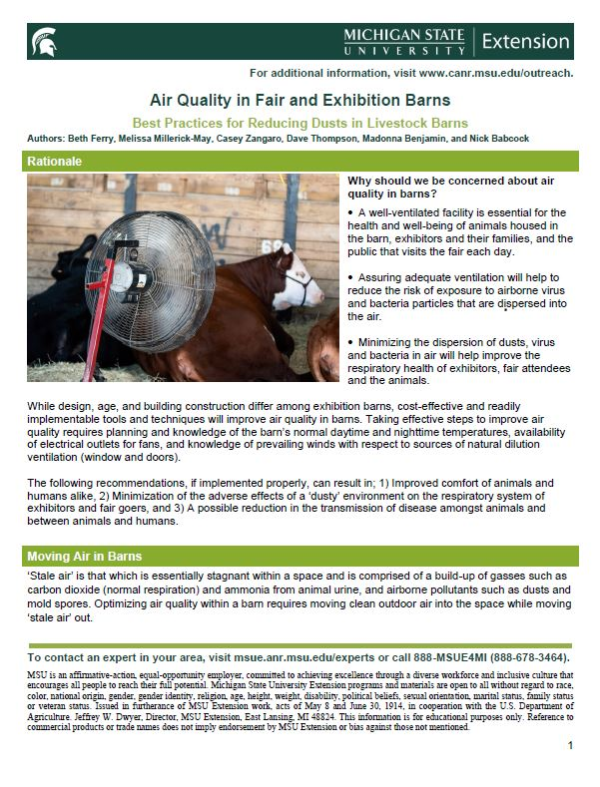 The following recommendations, if implemented properly, can result in; 1) Improved comfort of animals and humans alike, 2) Minimization of the adverse effects of a ‘dusty’ environment on the respiratory system of exhibitors and fair goers, and 3) A possible reduction in the transmission of disease amongst animals and between animals and humans.