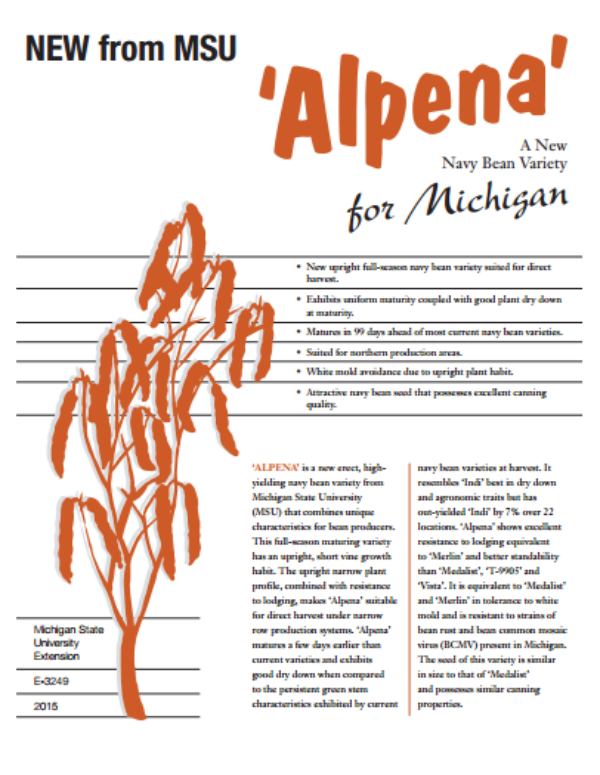 Kelly, J. D., Wright, E. M., Varner, G. V., & Sprague, C. L. (2015). ‘Alpena’: A new navy bean variety for Michigan [E3249]. East Lansing: Michigan State University, MSU Extension.