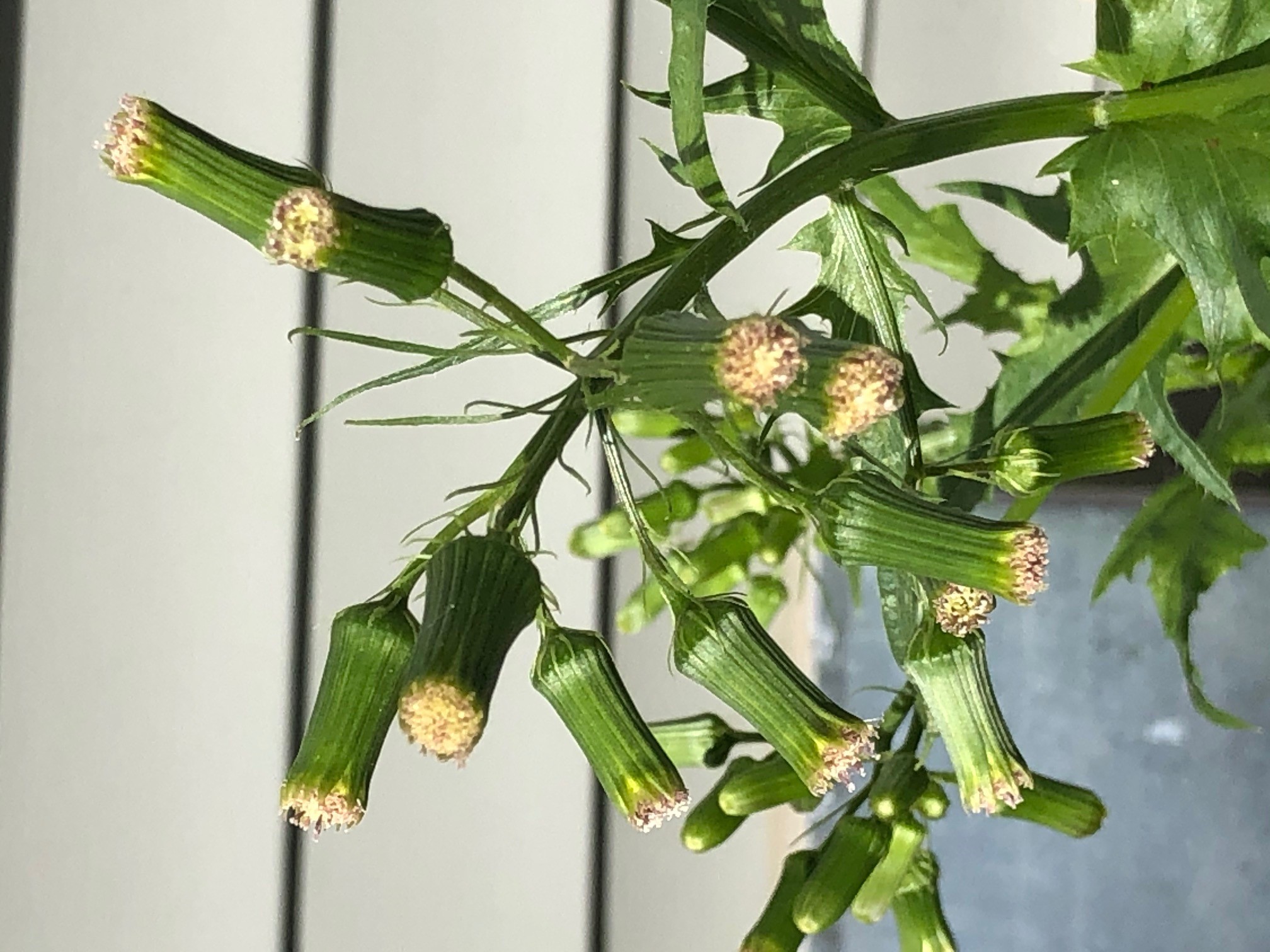 Green flower head is an inch long. Flowers never appear to open. At the end of the green sepals are short white to yellow disk flowers that only slightly emerge for pollination (no showy ray flowers). After pollination and seed development, tufts of white hair emerge, like dandelion, to carry the brown seeds with the wind.