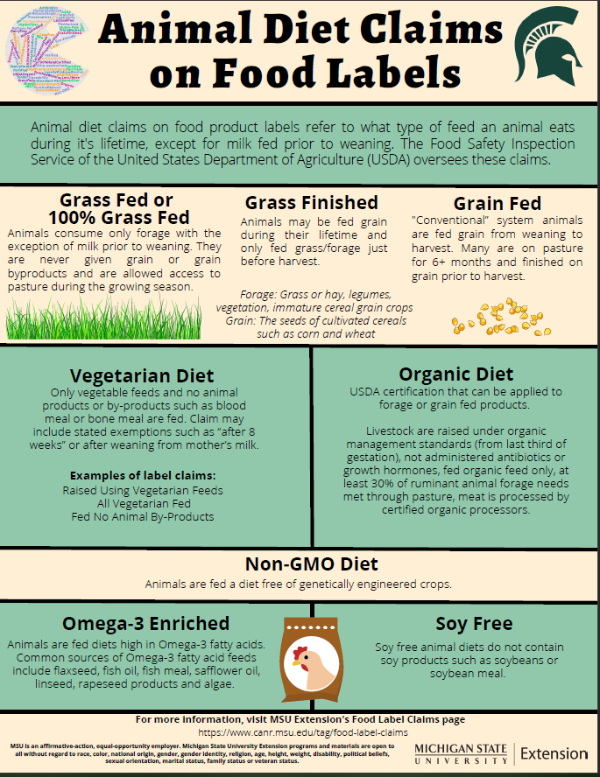Animal diet claims on food product labels refer to what type of feed an animal eats during its lifetime, except for milk fed prior to weaning. The Food Safety Inspection Service of the United States Department of Agriculture (USDA) oversees these claims.