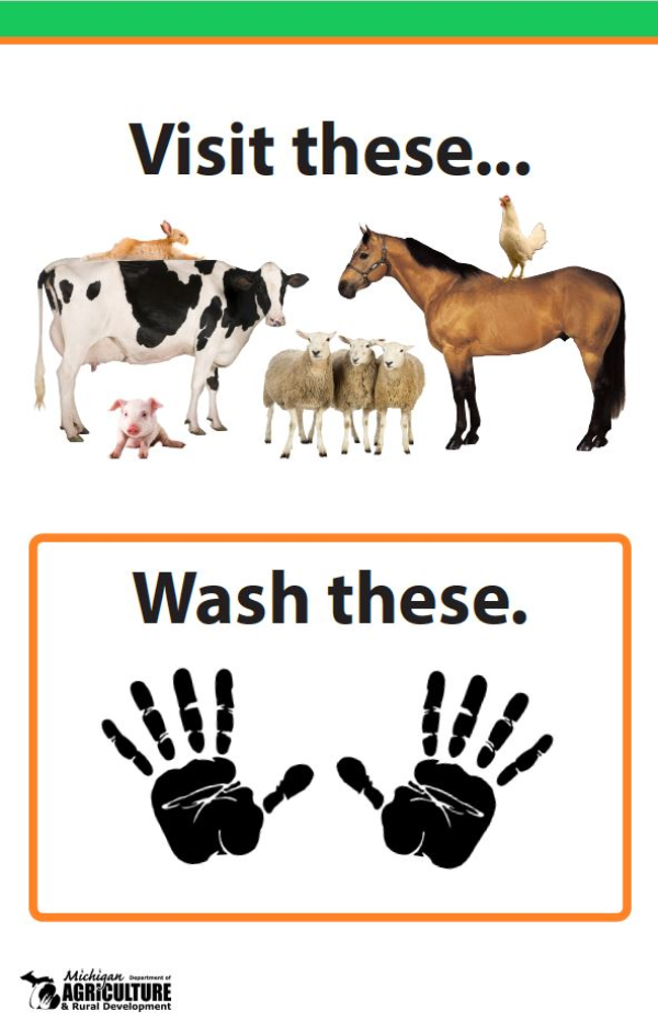 The following sign can be used to help visitors to animal barns and exhibits practice good hygiene and biosecurity by washing their hands after visiting.