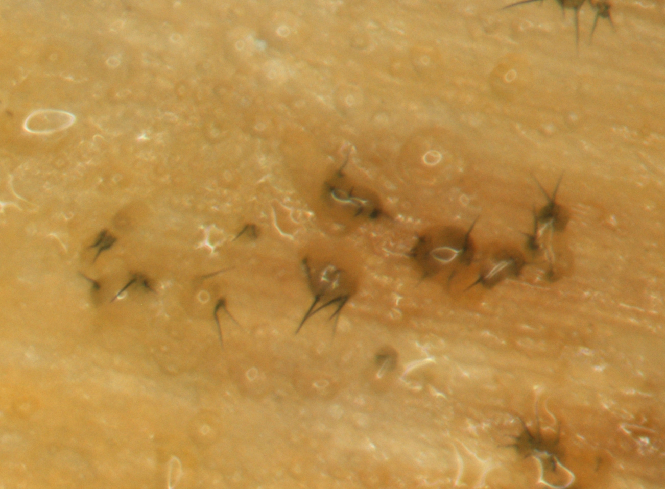Anthracnose of corn is caused by the fungus, Colletotrichum graminicola. The fungus survives in corn residue, first infecting the lower corn leaves as the spores are splashed from the soil surface. Leaf spots are round to irregular, water-soaked lesions with dark tan centers and yellowish-orange to reddish-brown borders. Lesions usually appear near the leaf tip and mid rib. Lesions can coalesce causing the lower leaves to shrivel and die. Fruiting bodies (acervuli) with black, whisker-like setae can be seen with a hand lens on infected leaves.