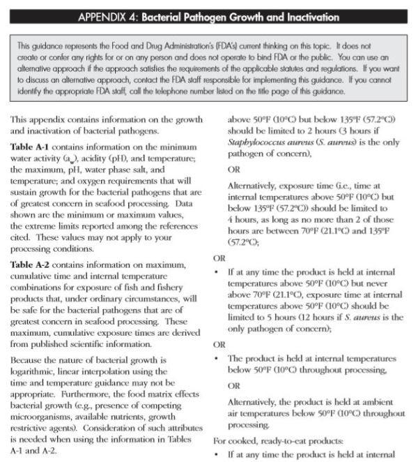 Table A-2 contains information on maximum, cumulative time and internal temperature combinations for exposure of fish and fishery products that, under ordinary circumstances, will be safe for the bacterial pathogens that are of greatest concern in seafood processing. These maximum, cumulative exposure times are derived from published scientific information. Because the nature of bacterial growth is logarithmic, linear interpolation using the time and temperature guidance may not be appropriate. Furthermore, the food matrix effects bacterial growth (e.g., presence of competing microorganisms, available nutrients, growth restrictive agents). Consideration of such attributes is needed when using the information in Tables A-1 and A-2.