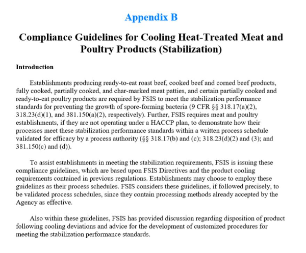 Also within these guidelines, FSIS has provided discussion regarding disposition of product following cooling deviations and advice for the development of customized procedures for meeting the stabilization performance standards.