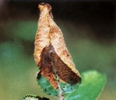 Apple-and-thorn skeletonizer (Choreutis pariana, AATS) is a little known, tiny caterpillar was a widespread pest of ornamental crabapple trees 15 years ago. But since then, it has virtually disappeared from the local landscape. Besides crabapple, it also feeds on apple, birch, cherry, hawthorn, willow and mountain ash. This insect is known to occur from Virginia to northern California and north into parts of Canada. It is reported to be a serious pest of commercial apple orchards in British Columbia. The adult is a rather pretty little moth about 1/4 of inch long with the wings brown with hints of gray and somewhat sculpted at the tips. The wings are held flat over the abdomen in a distinctive “V” or delta-shaped posture. The AATS develops from egg to adult very quickly and four generations may occur in a single season. In the spring, the overwintering moths begin to lay eggs shortly after the leaves unfold. After hatching, the tiny caterpillar begins feeding on the lower surface of the leaf under a loose covering of silk. Later, it moves to the upper surface where it ties the edges of the leaf together, forming a protective shelter. Here the caterpillar feeds on the tissue between the veins giving the leaf a lace-like or “skeletonized” appearance. Severely damaged leaves may prematurely drop from the tree. During warm weather, the AATS may complete its life cycle in 30 days or less.