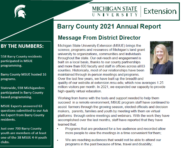 Michigan State University Extension (MSUE) brings the science, programs and resources of Michigan's land grant university to organizations, communities and individuals throughout the state. Our out-reach and engagement is built on a local basis, thanks to our county partnerships and more than 600 faculty and staff in offices across all 83 counties. Historically, most of our relationships have been maintained through in-person meetins and programs. Over the last few years, we have built up the breadth and quality of our website at extension.msu.edu, which now averages 1.25 million visitors per month. In 2021, we expanded our capacity to provide high-quality virtual education.