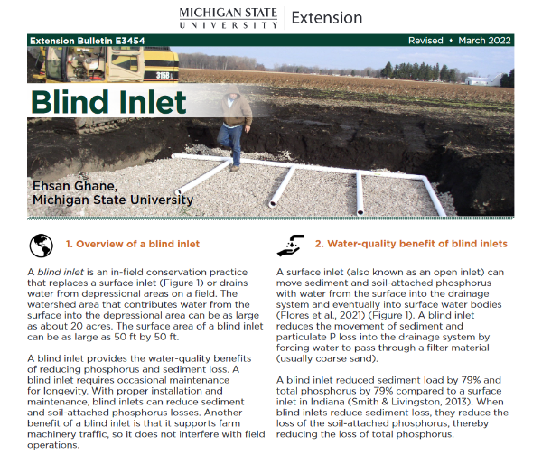 A blind inlet provides the water-quality benefits of reducing phosphorus and sediment loss. A blind inlet requires occasional maintenance for longevity. With proper installation and maintenance, blind inlets can reduce sediment and soil-attached phosphorus losses. Another benefit of a blind inlet is that it supports farm machinery traffic, so it does not interfere with field operations.